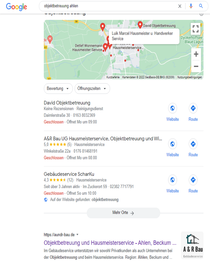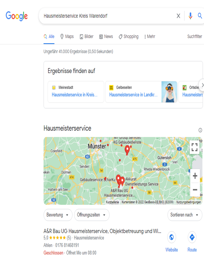 Besonders erfreulich ist, dass die durch uns optimierte Google My Business-Präsenz der A&R Bau GmbH zu herausragenden Platzierungen in der Region für relevante Keywords geführt hat. Diese gesteigerte regionale Sichtbarkeit hat das Unternehmen in der Zielgruppe noch bekannter gemacht und neue Chancen eröffnet.